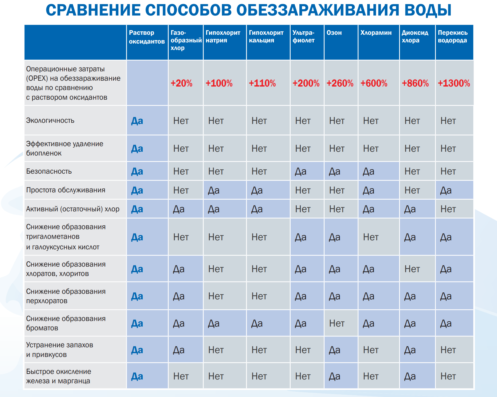 себестоимость обеззараживания в 1,5–10 раз ниже, чем при использовании хлора, гипохлорита или УФ.